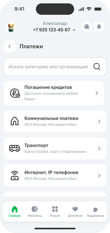 - 2В разделе «Платежи» выберите услугу и провайдера — для этого можно воспользоваться поиском.